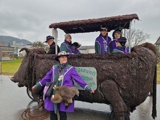 Dem Regen getrotzt haben wir beim Umzug in Wolfurt. Unsere gute Stimmung wurde dadurch auch nicht getrübt. Selbst das Publikum zeigte sich wetterfest. Die beste Figur machten natürlich unsere gehenden Wildsauen, die am trockendsten blieben. Leider bekam unsere Mama-Sau einen Plattfuß und mußte am Abend noch in die Wertstatt, um bereit für den Umzug in Lustenau zu sein.
